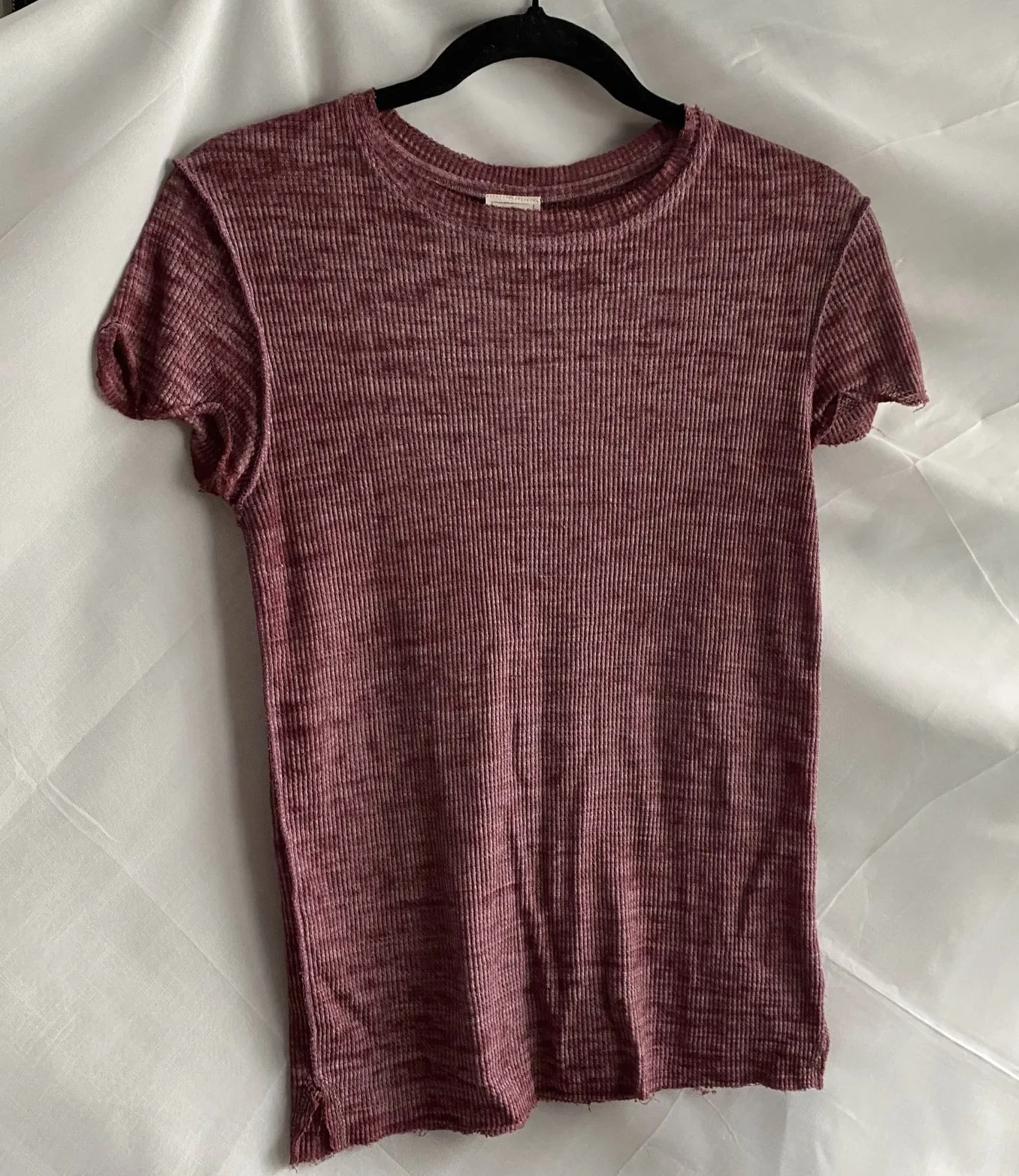 Free People ribbed henley top in a distressed burgundy red pattern. Features a classic crew necklin... Show more