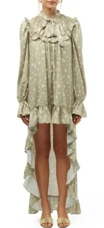 WeWoreWhat High Low Polka Dot Floral Drape Ruffled Long Sleeve Dress Lined Removable Slip S Sage Oat Green Pink Hues adds a touch of nature-inspired beauty. Made from chiffon with ruffles along the cuffs, the bib-front and the tiered hem. It's designed to drape loosely over the figure, with a deep keyhole neckline that draws in with ties, billowy long sleeves and a detachable inner slip for coverage. High low cut Ruffle hem and bib Neck ties Deep keyhole Elastic, ruffled sleeves Flowy silhouette Removable slip lining Snaps at shoulder seam Brand New With Tags. No Flaws Measurements in photos. Professional Seller. Ship Same/Next Day. Offers Welcome. 4225 15 oz Bohemian festival wear resort wear vacation beach party Nashville brunch statement spring summer lightweight coastal cowgirl Evening Casual Chic Formal Dinner Event Wedding Guest Birthday Cocktail Floral Feminine Dress Twee Chic Emily in Paris Euphoria Glam, Feminine stylish high-low dress, flowy floral dress, Western