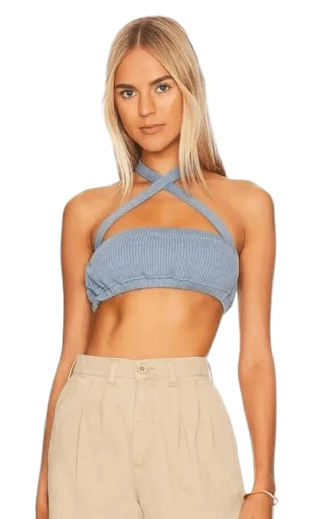 WeWoreWhat blue halter top with tie at neckline. Sleeveless crop top has a wide ribbed fabric. Material is a soft knit in a pretty color called Storm. New with tags! Measurements shown in images. 0424-52-BB