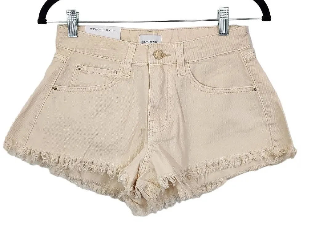 Revolve We Wore What cream jean shorts. Make me an offer! Style: Cut-off Color: Cream, called Unbleached on tag Special features: Frayed hem, pockets Closure: Button and zipper Condition: New with tags Measurements are approximate and taken while laying flat. Waist: 13.25" Inseam 1.75" Outseam 9.35" Rise 9.5" 0224-12-BB