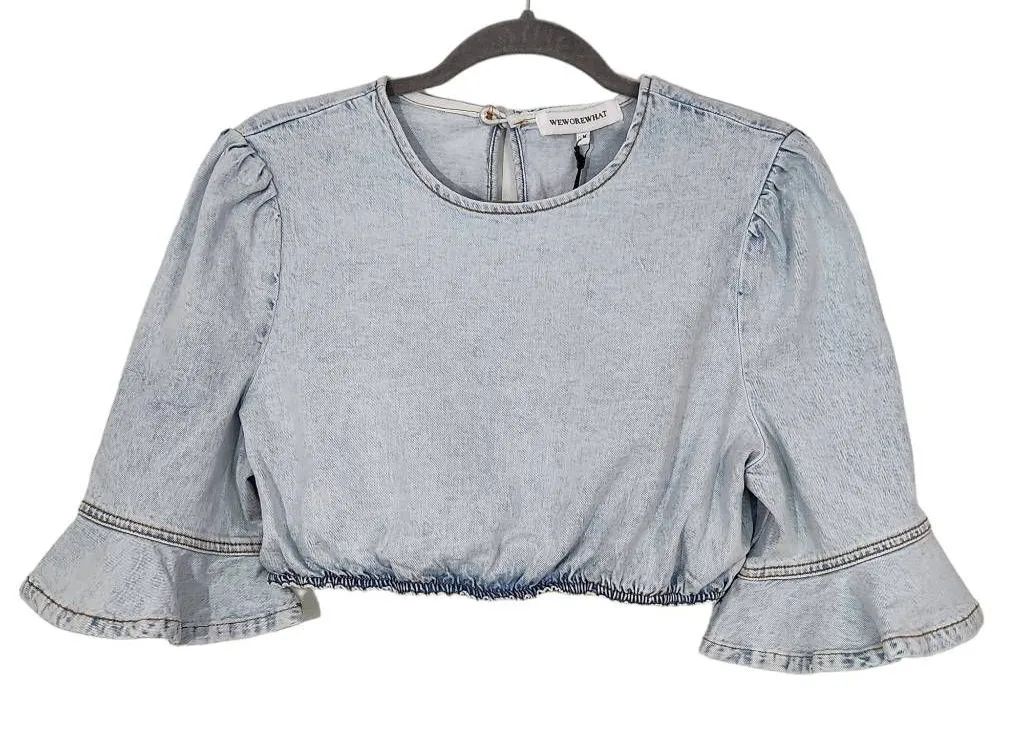 WeWoreWhat jean top with round neckline and keyhole cutout in back. Ruffle accent sleeve crop top has elbow-length sleeves. Color is called Indigo Comfort Superlight. New with tags! Make me an offer! Measurements are approximate and taken while laying flat: Length 11.25" center to hem Bust 18.25" pit to pit 0424-83-BB
