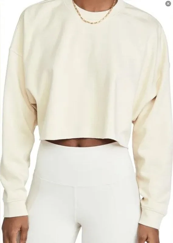 clean girl, minimalist athleisure, modern basics, neutral core, effortless casual Chic WeWoreWhat cropped sweatshirt in a solid off-white tone with a modern raw hem finish. Features a relaxed, boxy silhouette with dropped shoulders for an effortless, elevated athleisure look. Perfect for pairing with high-rise leggings, joggers, or denim for a clean, minimalist aesthetic. • Brand: WeWoreWhat • Style: Cropped sweatshirt • Color: Off white / cream • Size: Womens Small