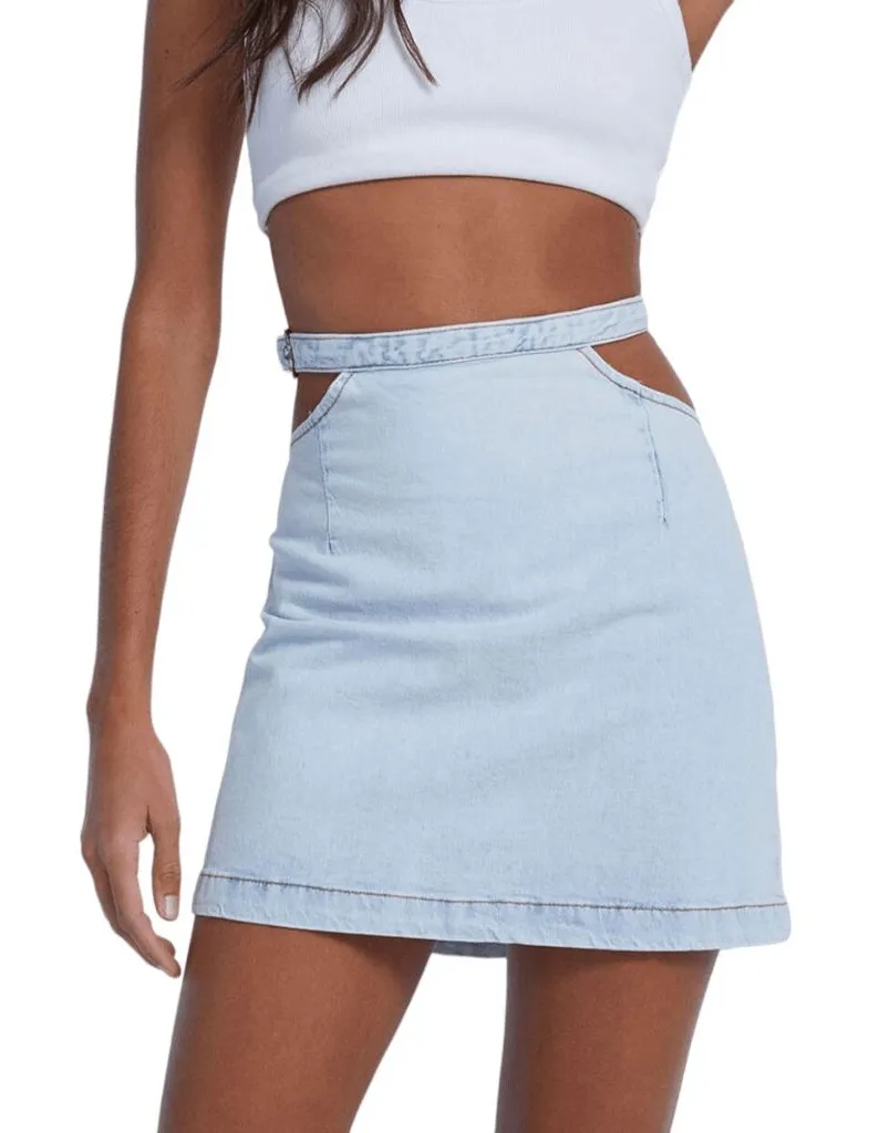 Revolve We Wore What jean skirt in a mini style. Make me an offer! Style: A-Line Length: Mini Color: Light wash denim with fading, Indigo Comfort Super Light is tag name Special features: Cutout detail Closure: Back zipper, belt buckle for adjustable waist Condition: New with tags Measurements are approximate and taken while laying flat. Waist: 15.5" at cutout area Length: 16" center to hem 0224-41-BB
