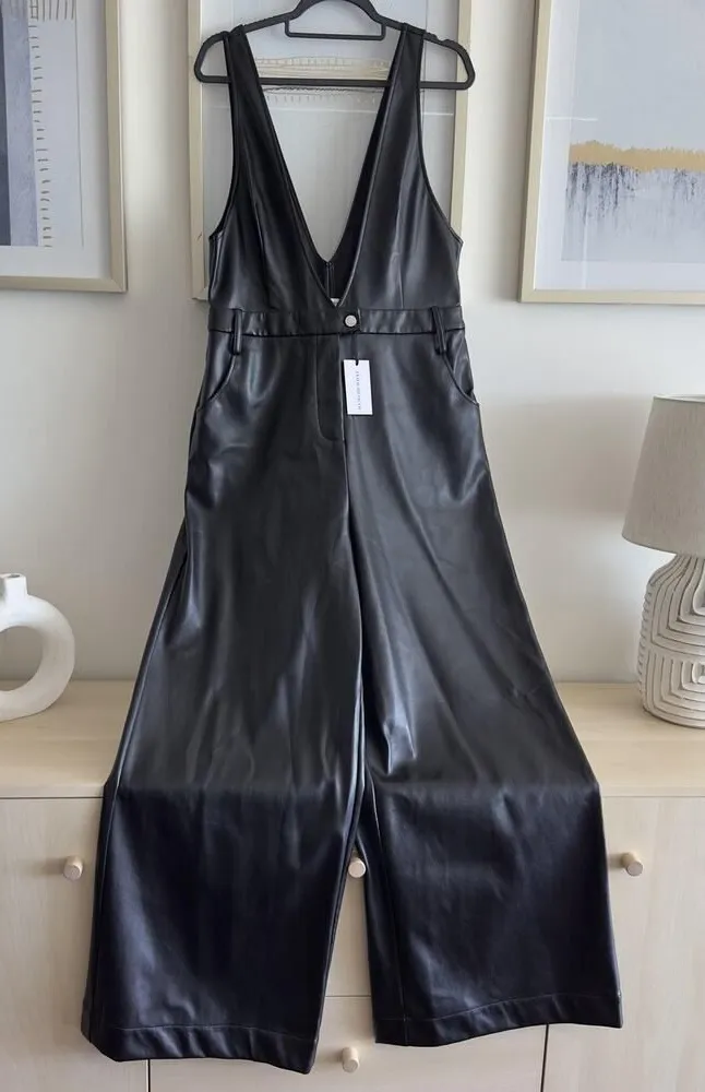 WeWoreWhat Overall Womens 32 Black Faux Leather Deep V Flare Jumpsuit Stretch Condition: Brand New... Show more
