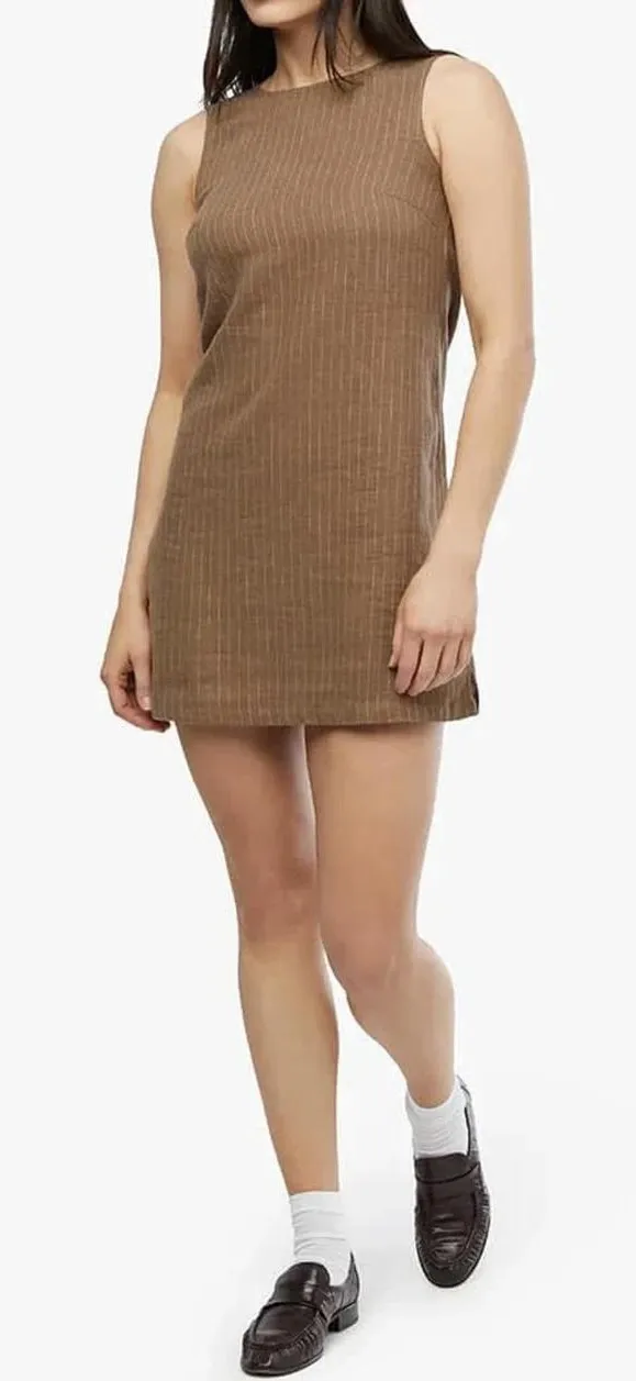55% Linen 45% Viscose Made from linen blend, this mini dress has an A-line cut with a high neckline and side slits at the hem. Stay cool on warm days in this sleeveless minidress cut from an airy linen blend in a subtle A-line silhouette. Back keyhole with button-and-loop closure Crewneck Sleeveless Unlined Linen blend dress Slim fit Muscle tank bodice