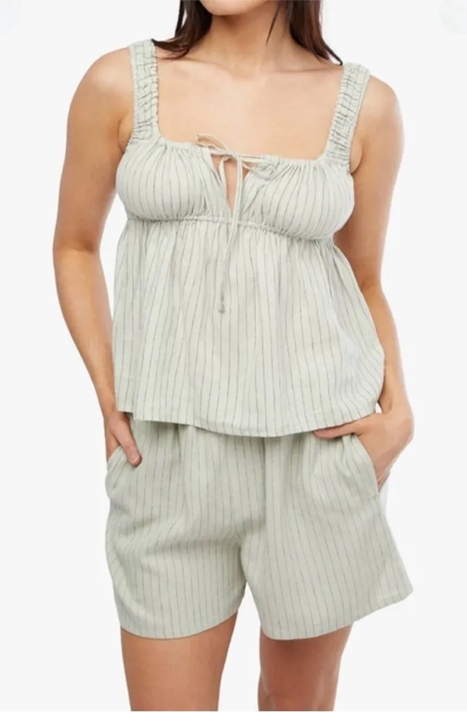 This Sage striped linen blend camisole top by WeWoreWhat features a delicate sweetheart neckline and thin shoulder straps, offering a chic and feminine look. Crafted from a lightweight fabric, it ensures comfort and breathability, making it perfect for lounging or sleeping.