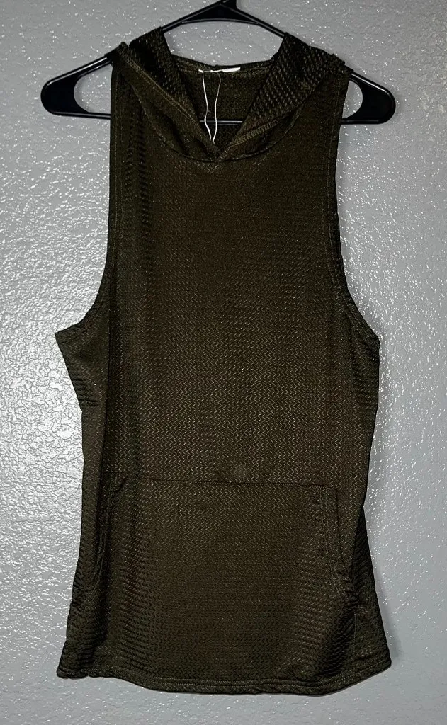 Stylish and breathable We1Fit sleeveless hoodie top in olive green. Features a soft, textured athletic material, front kangaroo pocket, and a relaxed fit perfect for workouts, yoga, running, or layering over a sports bra. Designed for comfort and mobility. Fit Description: Relaxed fit; sleeveless cut with roomy armholes and attached hood. Hashtags: #We1Fit #AthleticTop #WorkoutWear #GymHoodie #ActiveStyle #OliveGreen #SleevelessHoodie #FitnessFashion #YogaTop #CasualActivewear