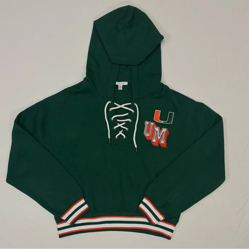New with tags WEAR by Erin Andrews University of Miami Hurricanes hoodie. Green lace-up style with embroidered UM logo on front and striped ribbed cuffs and hem. Pullover hoodie with soft fleece interior. Size: Women’s Large Brand: WEAR by Erin Andrews Condition: New with tags (NWT) MSRP: $79.99