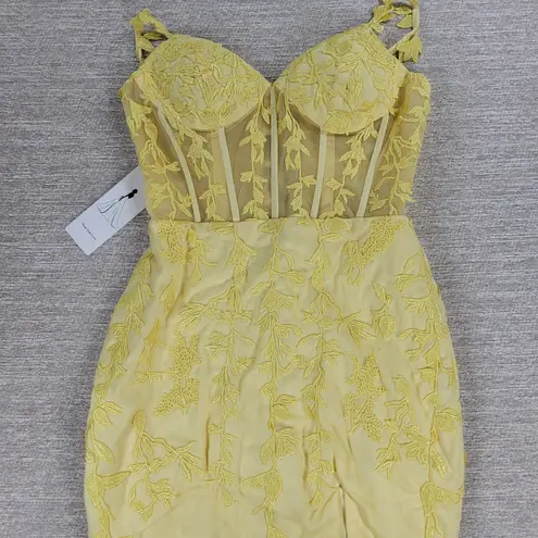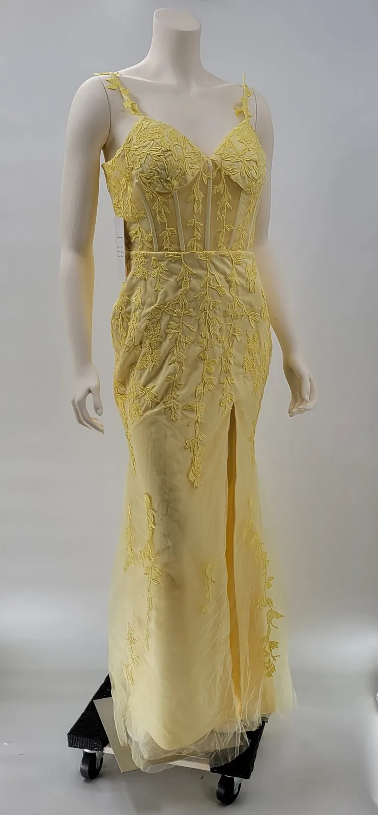 A striking yellow prom and evening gown featuring intricate floral lace detailing throughout. This d... Show more