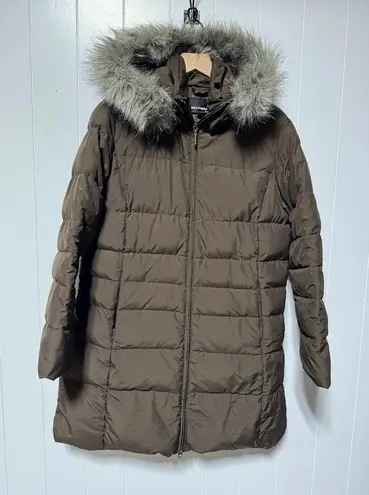A women's brown puffer coat from Weatherproof Garment Company. This cozy coat features a full zip front closure and a detachable faux fur trim on the hood, providing warmth and style. Perfect for everyday wear, outdoor adventures, or chilly commutes. Condition: Lightly used, no noticeable flaws Approximate Measurements: • Chest: 21.5 in • Length: 35.5 in • Size: L Type: Coat Outer Shell Material: Polyester Style: Puffer Jacket Department: Women Lining Material: Polyester Accents: Fur Trim, Zipper Features: Insulated, Padded, Pockets, Hooded, Lined Pattern: Solid Insulation Material: Down Season: Winter, Fall Closure: Zip Occasion: Casual Sleeve Length: Long Sleeve Fit: Regular Keywords: puffer coat, winter coat, insulated jacket, hooded coat, faux fur hood, down fill, outdoor wear, cold weather, casual jacket, travel wear, everyday comfort