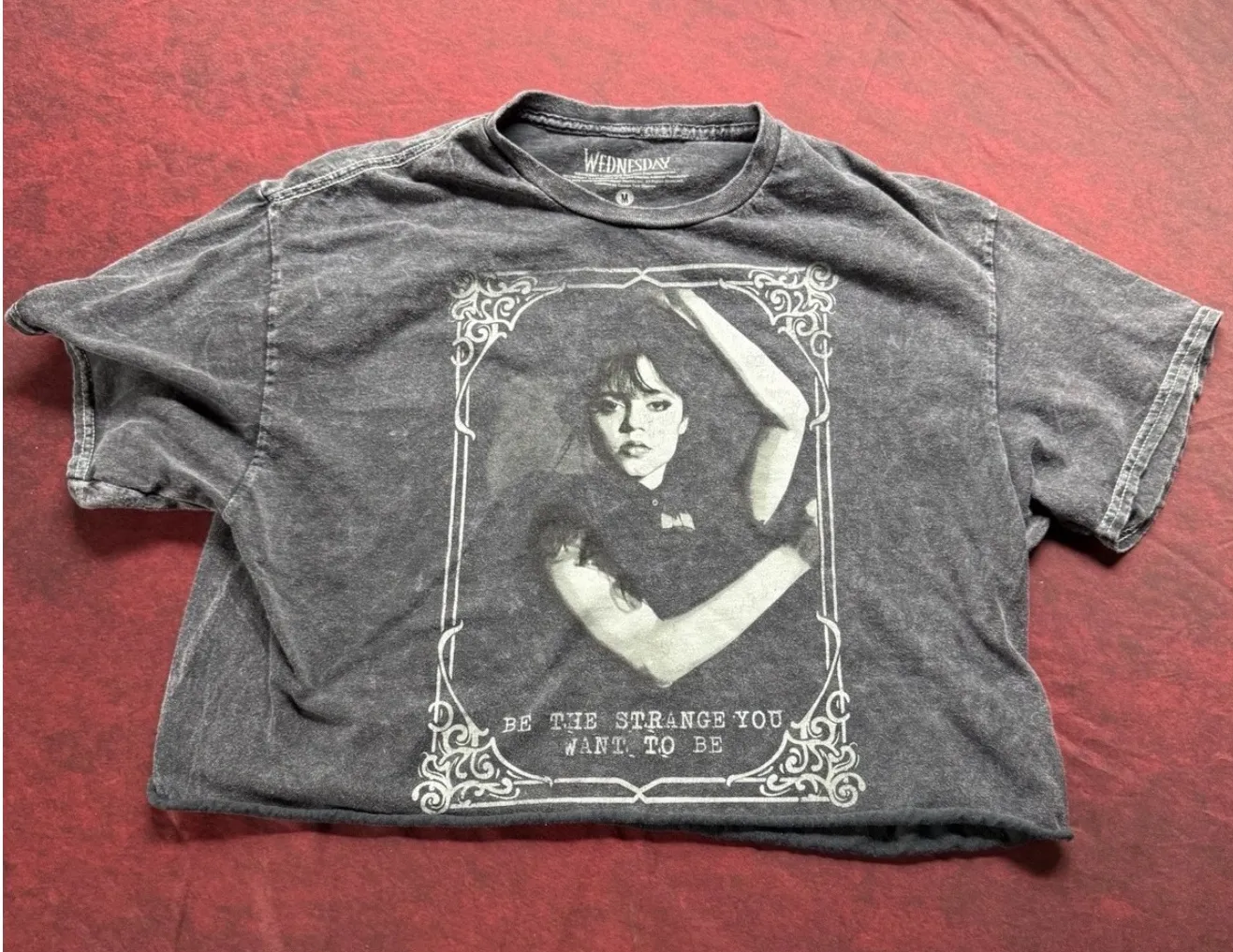 Embrace your inner Wednesday Addams with this striking graphic crop top, a must-have for any fan of the iconic character. The vintage-inspired wash gives this tee a perfectly worn-in feel, while the bold portrait of Wednesday and the empowering "Be The Strange You Want To Be" slogan add a touch of rebellious charm. This comfortable and stylish top is ideal for expressing your unique personality at concerts, casual hangouts, or even themed parties. Measurements: • Pit to pit: 19 inches • Length: 17 inches Type: T-Shirt Department: Women Style: Cropped Material: Cotton Blend Neckline: Crew Neck Sleeve Length: Short Sleeve Sleeve Type: Classic/Fitted Sleeve Theme: Wednesday Addams, Movie, Goth, Alternative Character: Wednesday Addams Fit: Regular Keywords: Wednesday Addams shirt, Wednesday Addams t-shirt, graphic tee, crop top, vintage wash, Be The Strange You Want To Be, Netflix series, Jenna Ortega, alternative fashion, goth clothing, dark academia, quirky t-shirt, statement tee, fan