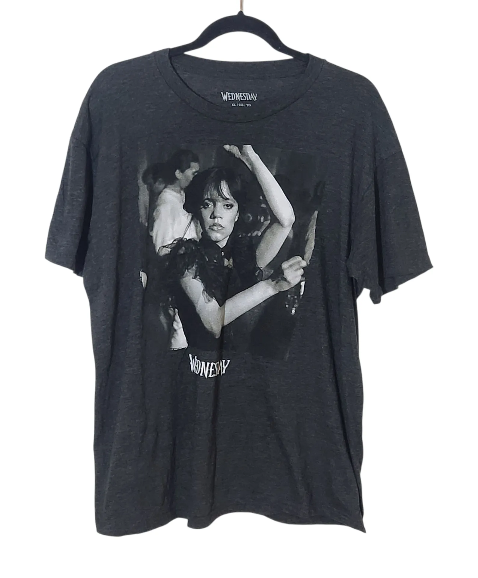 Dark gray t-shirt featuring a graphic design from Wednesday with short sleeves and a cotton blend fabric. Same-day shipping for orders received on weekdays by noon CST. Make me an offer! Measurements are taken while laying flat and shown in images. Condition: used, excellent condition 2509-29
