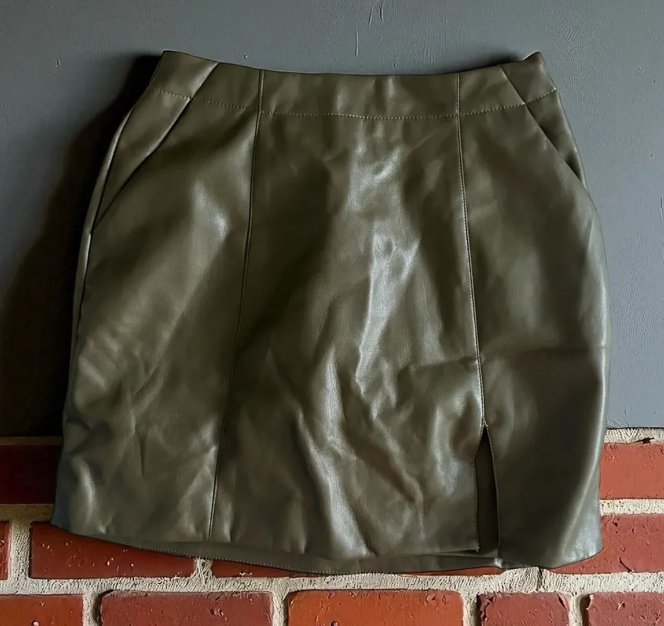 Elevate your style with this chic olive green faux leather skirt. Perfect for a night out or a styli... Show more