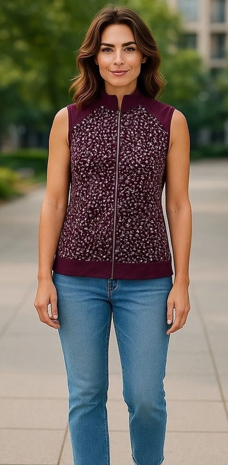 Weekends by Chico's Women's Burgundy Floral Print Zip Up Vest Size 1 A stylish burgundy vest adorned with a vibrant floral print. This sleeveless vest features a stand-up collar and a full-zip front closure for easy wear and layering. The contrasting solid burgundy panels on the shoulders and hem add a sophisticated touch, while the patterned front and back create a visually appealing look. The fabric blend offers comfortable stretch for all-day wear. Measurements: • Chest (pit to pit): 19 in • Length (shoulder to hem): 24 in Features: Collared, 1/2 Zip, Breathable, All Seasons Fabric Type: Knit Pattern: Floral Season: Spring, Fall, Summer Closure: Zip Occasion: Casual, Travel This item is in good preowned condition. It comes from a non-smoking, pet-free home. • Kindly review all photos carefully before purchasing. • Quick Shipping ! Same or Next Day! • Fabric tags shown in photos If still attached • All measurements are take unstretched and are APPROXIMATE
