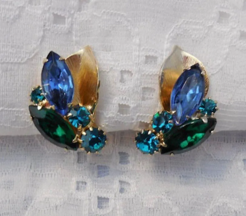 BEAUTIFUL VINTAGE CLIP-ON EARRINGS DESIGNER SIGNED "WEISS" GOLD TONE METAL WITH A BRUSHED GOLD TONE LEAF BLUE & GREEN LARGE MARQUISE RHINESTONES AND THESE SUPER SPARKLY TEAL COLORED ROUND STONES MEASURES 1 1/8" X 11/16" HONESTLY, TOTALLY MAGNIFICENT!!!! IN EXCELLENT VINTAGE CONDITION (THESE SHOULD REALLY BE IN THE MOVIES!!!)