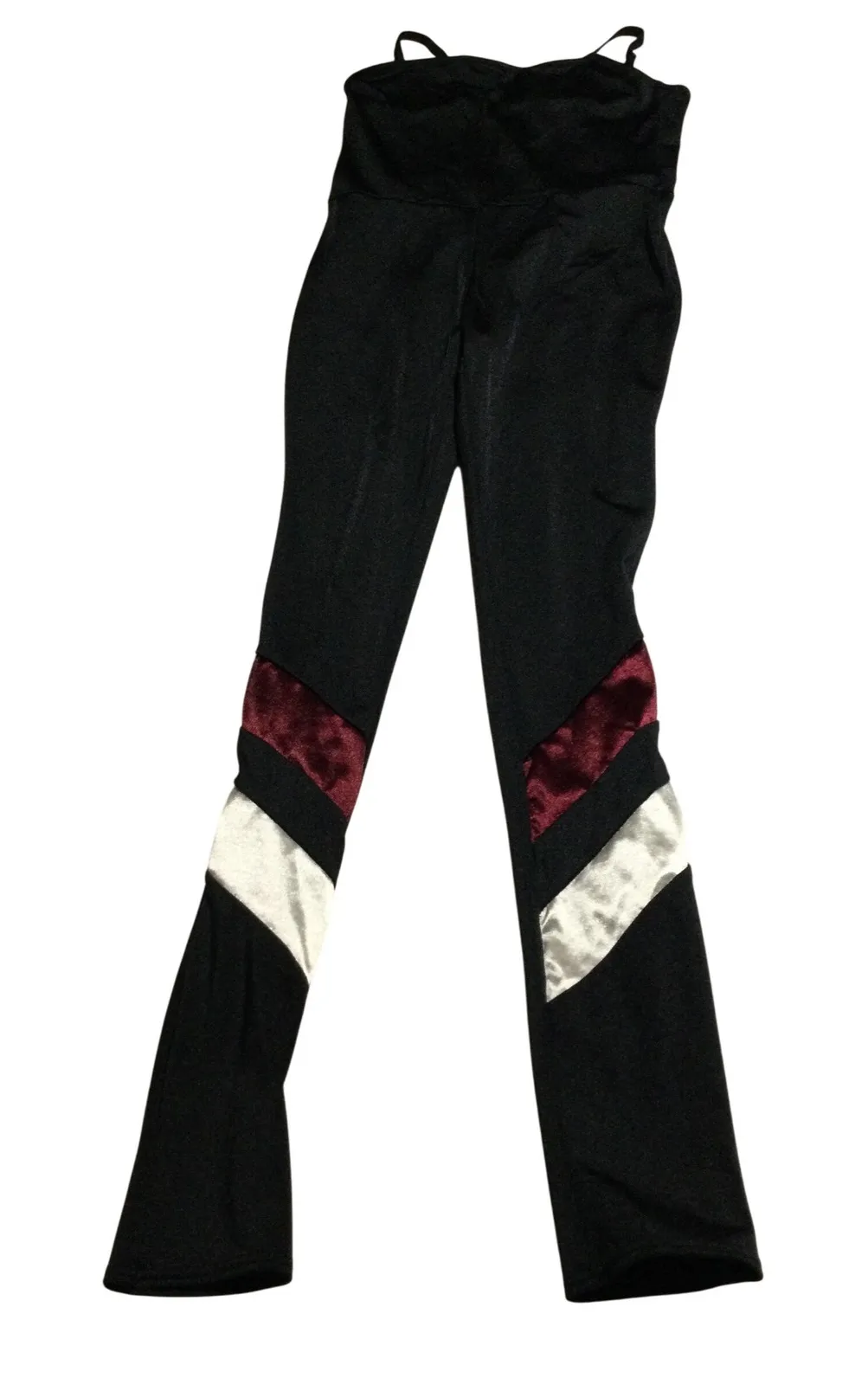 Unleash your inner performer in this striking Weissman unitard. Crafted for movement and style, this piece boasts bold chevron-style velvet insets of deep burgundy and shimmering silver along the legs, creating a dynamic visual effect that's sure to turn heads. The sleek black fabric provides a flattering silhouette, while the adjustable spaghetti straps ensure a comfortable and secure fit for any routine. Perfect for dance class, gymnastics practice, or even a retro-inspired performance piece. Measurements: • Inseam: 36 in • Waist: 13 in Gender: Women Pattern: Geometric Prints Country of Origin: China Keywords: Weissman, unitard, leotard, dancewear, gymnastics, velvet, burgundy, silver, chevron, performance, workout, athletic, stage wear