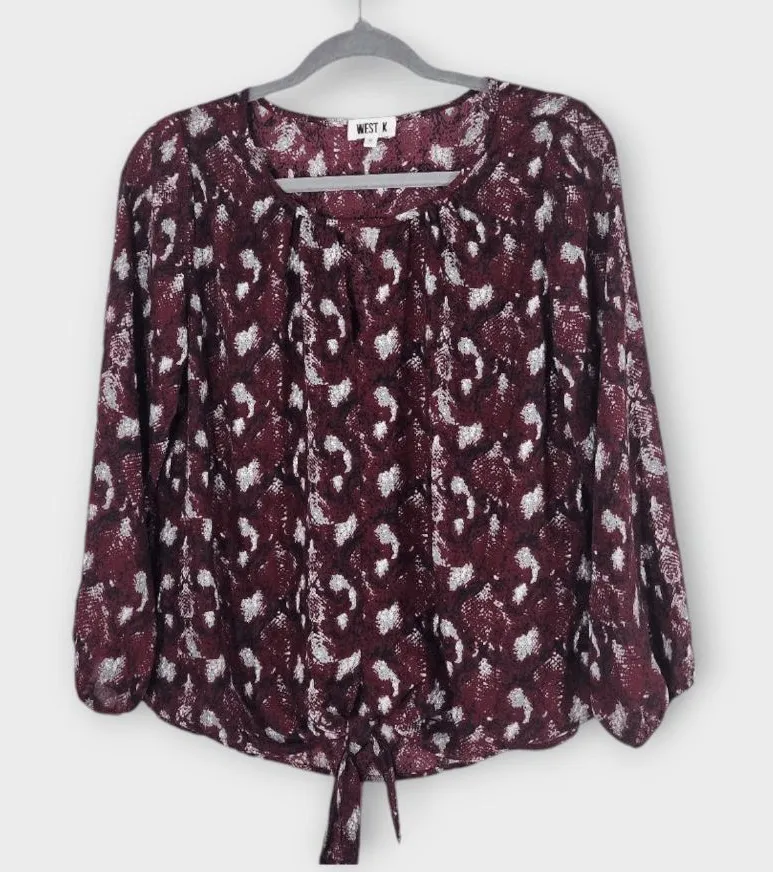 West K oxblood, black, and gray snakeskin print peasant top with tie at the hem. Make me an offer! Style: Peasant blouse, 3/4 sleeves Color: Burgundy snakeskin Special features: Elastic at end of sleeves, cutout at neckline Condition: Never worn Measurements are taken while laying flat and shown in images. 0924-103-BB