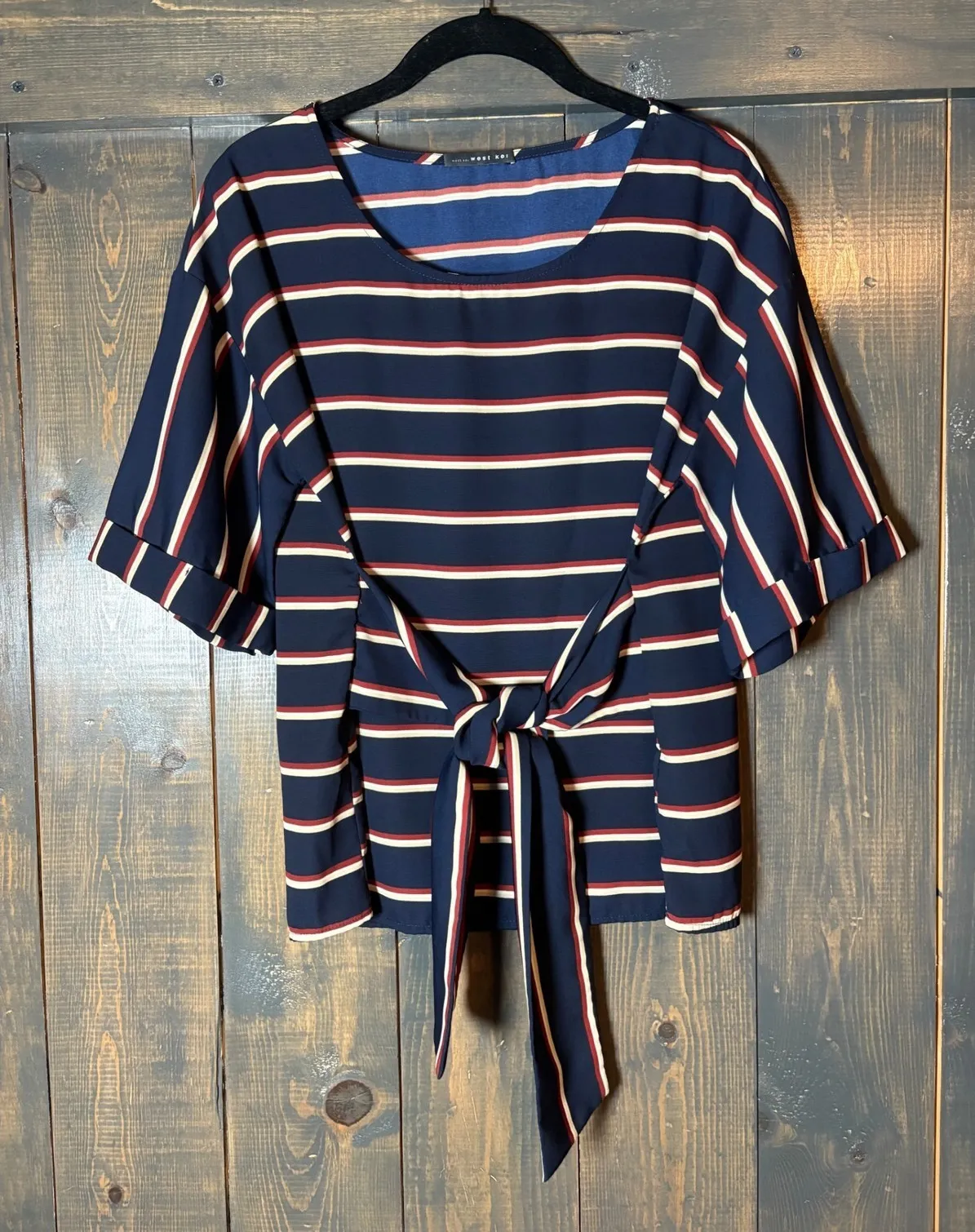 A symphony of stripes dances across this chic blouse, offering a modern twist on a classic design. The navy backdrop is punctuated by crisp white and subtle red stripes, creating a visually appealing pattern that's both sophisticated and playful. The relaxed fit and short sleeves provide effortless comfort, while the unique tie waist detail allows for a customized silhouette, cinching you in at just the right spot. This top is perfect for adding a touch of elegance to your everyday wardrobe, whether you're heading to a casual brunch, a day at the office, or a relaxed evening gathering. Color: Blue Type: Blouse Department: Women Style: Basic Material: Neckline: Boat Neck Sleeve Length: Short Sleeve Sleeve Type: Short Sleeve Accents: Tie Pattern: Striped Features: Tie Waist, Relaxed Fit, Lightweight, Side Tie, Cuffed Sleeves Fit: Relaxed Keywords: striped blouse, tie waist top, navy blue blouse, short sleeve top, casual blouse, womens top, red and white stripes, relaxed fit blouse, contemporary fashion, West Kei, striped shirt, tie front top, summer blouse