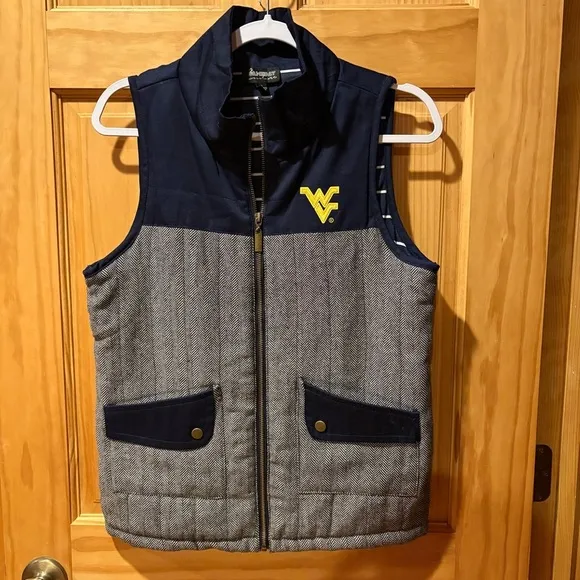 Questions in comments. Measurements in pictures this Stylish Gameday Couture West Virginia vest. Features a navy top with a gray herringbone pattern. Embroidered logo on the chest. Two front pockets with button closures. Perfect for casual wear. Good condition size M