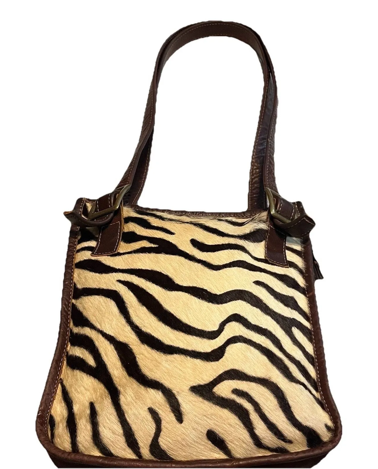 This is an unbranded western shoulder bag in dark brown leather with a hair-on cream and black zebra print panel and adjustable shoulder straps. Bag is in good pre-owned condition (SEE PHOTOS AND READ DESCRIPTION). Features: * Unbranded design with a handmade look - crafted in USA * Western, rugged, rodeo style in a shoulder tote silhouette * Features a zebra stripe hair-on cowhide front with distressed leather back, handles, and trim * Designed with double adjustable leather shoulder straps for comfortable wear * Dark brown leather body accented by cream and black zebra pattern * Finished with brass-tone hardware, top zip closure, and artisan details * Interior is unlined suede and leather with one zip pocket, a large pocket for phone or other important item, and slip compartments * Perfect for Western wear, rodeo events, rustic boho outfits, or cowgirl chic style rustic western bag, rodeo leather purse, handmade USA cowhide tote, cowgirl handbag, distressed leather western purse APPROXIMATE MEASUREMENTS: WIDTH - 10" HEIGHT - 11" DEPTH - 2.5" HANDLE DROP - 13" CONDITION NOTES (SEE PHOTOS): * STURDY USA-MADE BAG WITH RUSTIC WESTERN CHARACTER, IN OVERALL GOOD PRE-OWNED CONDITION * DISTRESSED LEATHER SHOWS SCRATCHES, SCUFFS, AND NATURAL PATINA * STRAP ENDS HAVE CURLING (ON ALL STRAPS) * RAW LEATHER EDGES (ON STRAPS) ARE ORIGINAL TO DESIGN, NOT DAMAGE * INTERIOR WEAR INCLUDING SPOT ON BOTTOM OF INTERIOR