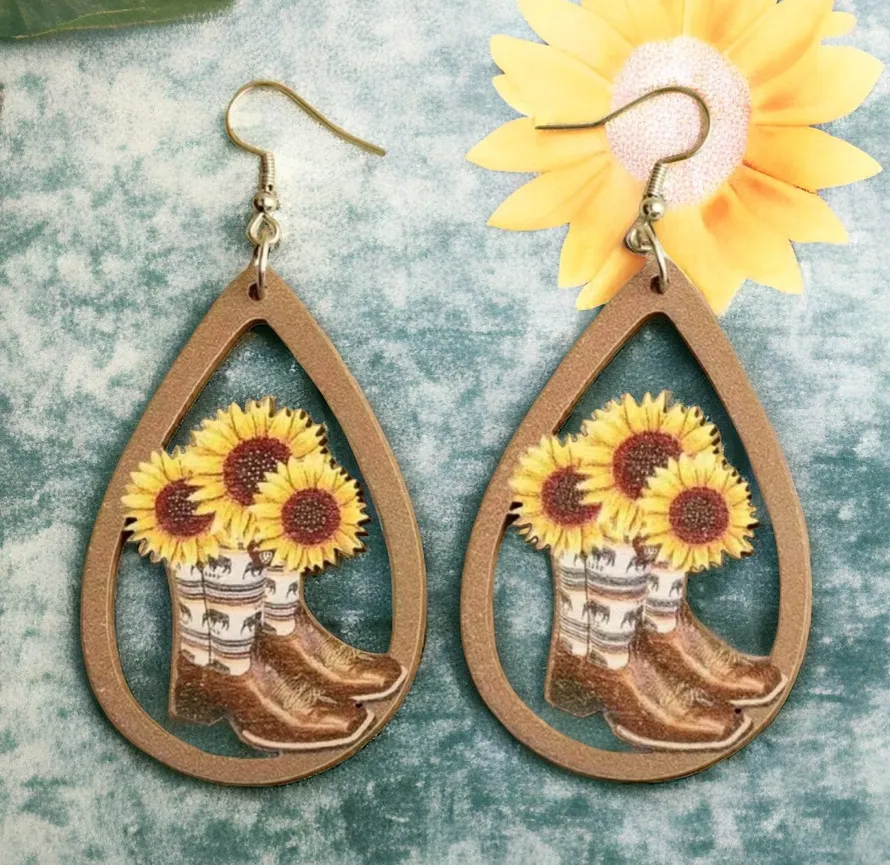 Western Retro Personality Cowboy Boots Sunflower Earrings Wooden Water Drop‎ - $13 New With Tags - From Mon