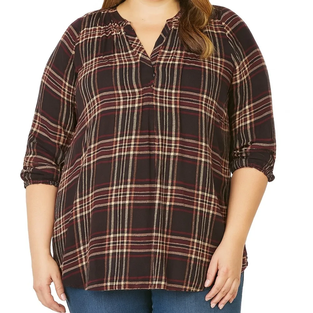 Westport Burgundy and Black Checkered V-neck Relaxed Fit Top Red Size 1X - $21 - From Trendy