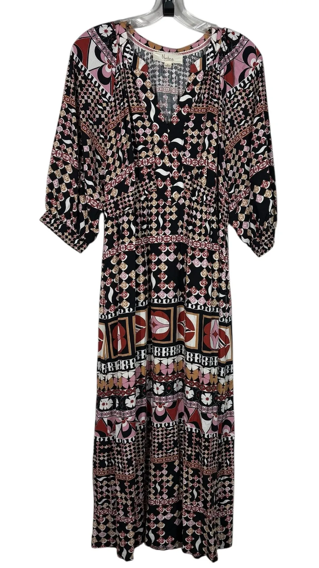 New with tags! Beautiful geometric and patchwork style designs all over. V-neck neckline. Slightly puffed sleeves. Floor length. Tiered design skirt. New, never used with no flaws! Size small. Pit to Pit: 19in Shoulder to Hem: 49in