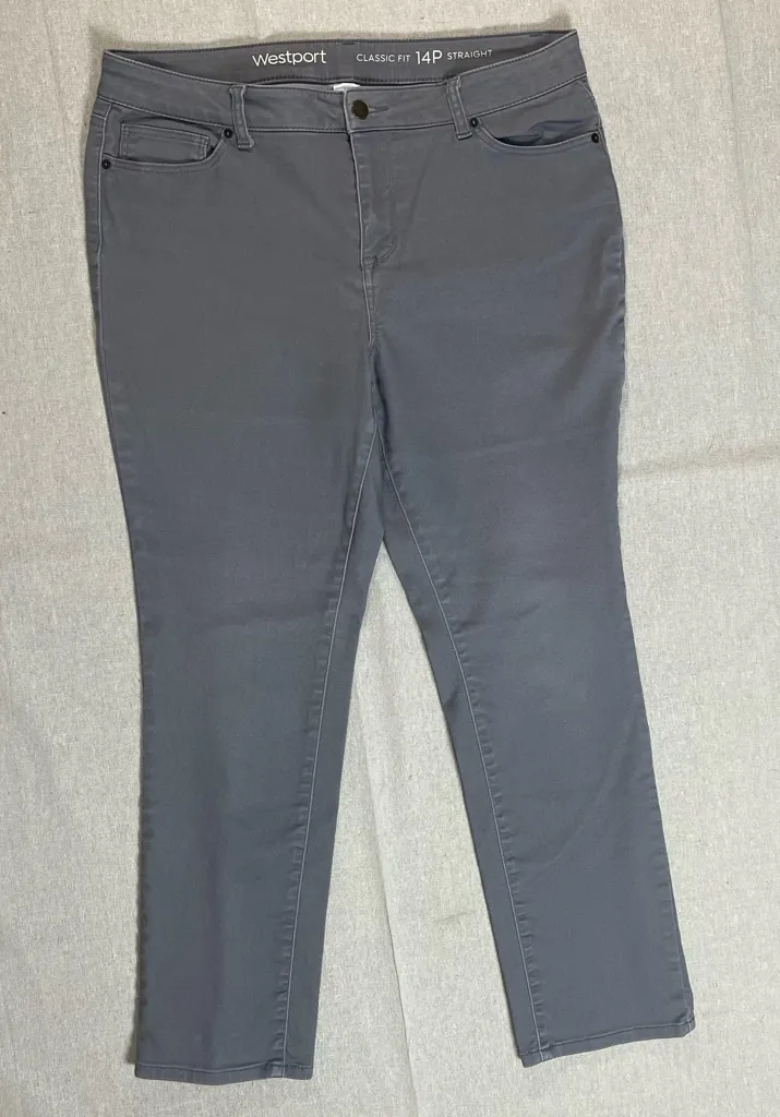 Zip fly with button closure Five pocket styling Belt loops Straight leg style Stretch brushed cotton blend fabric 69% cotton, 30% polyester, 1% spandex Machine wash Approximate measurements (lying flat): Waist: 18” Inseam: 28” Rise: 11” Smoke free home