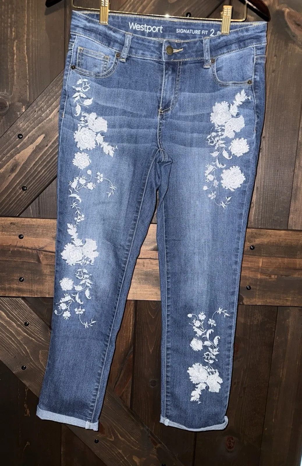 Westport Signature Fit 2 Boyfriend Skinny Jeans Stretch Floral Embroidered‎ Sz 2 Blue - $16 - From Dana