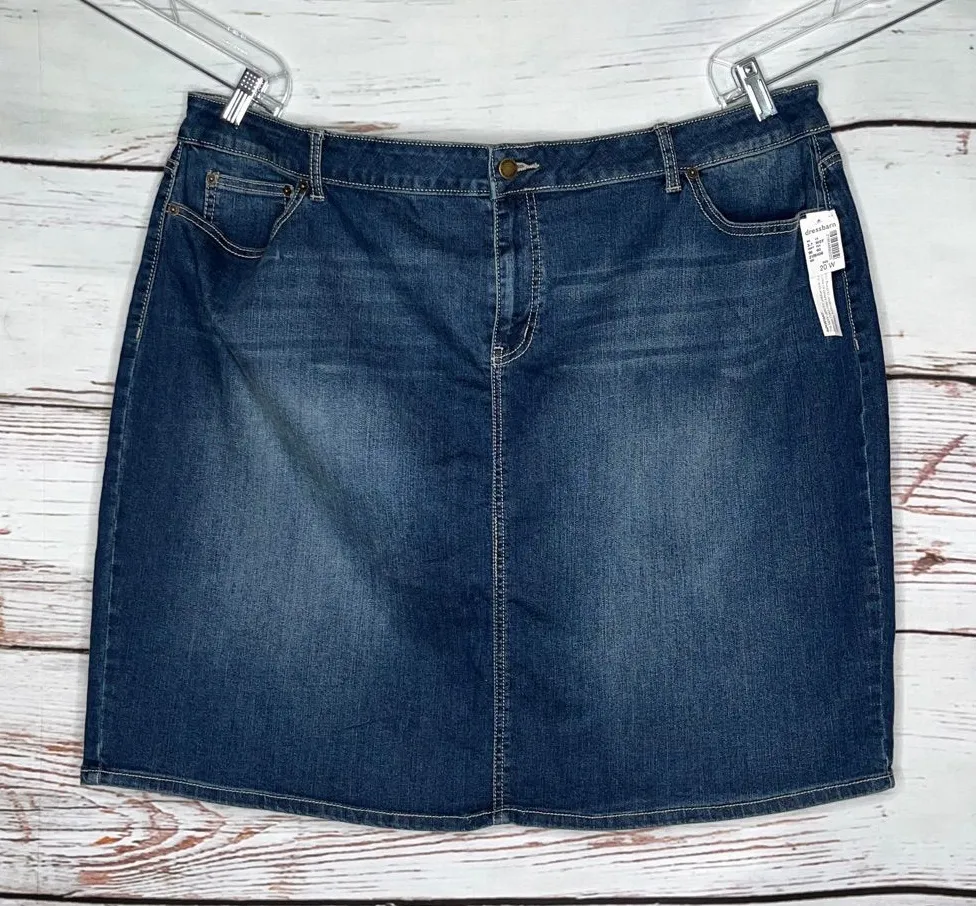 Westport Woman Size 20 Blue Denim Jean Pencil Skirt. Belt Loops. Button with Zipper Closure. 5 Pockets. 6.5” Back Slit. Cotton, Rayon, Polyester & Spandex Blend. NWT, Brand New with Tags. Length is 22.5” & Waist is 22”. Measurements taken while garment is laying flat.