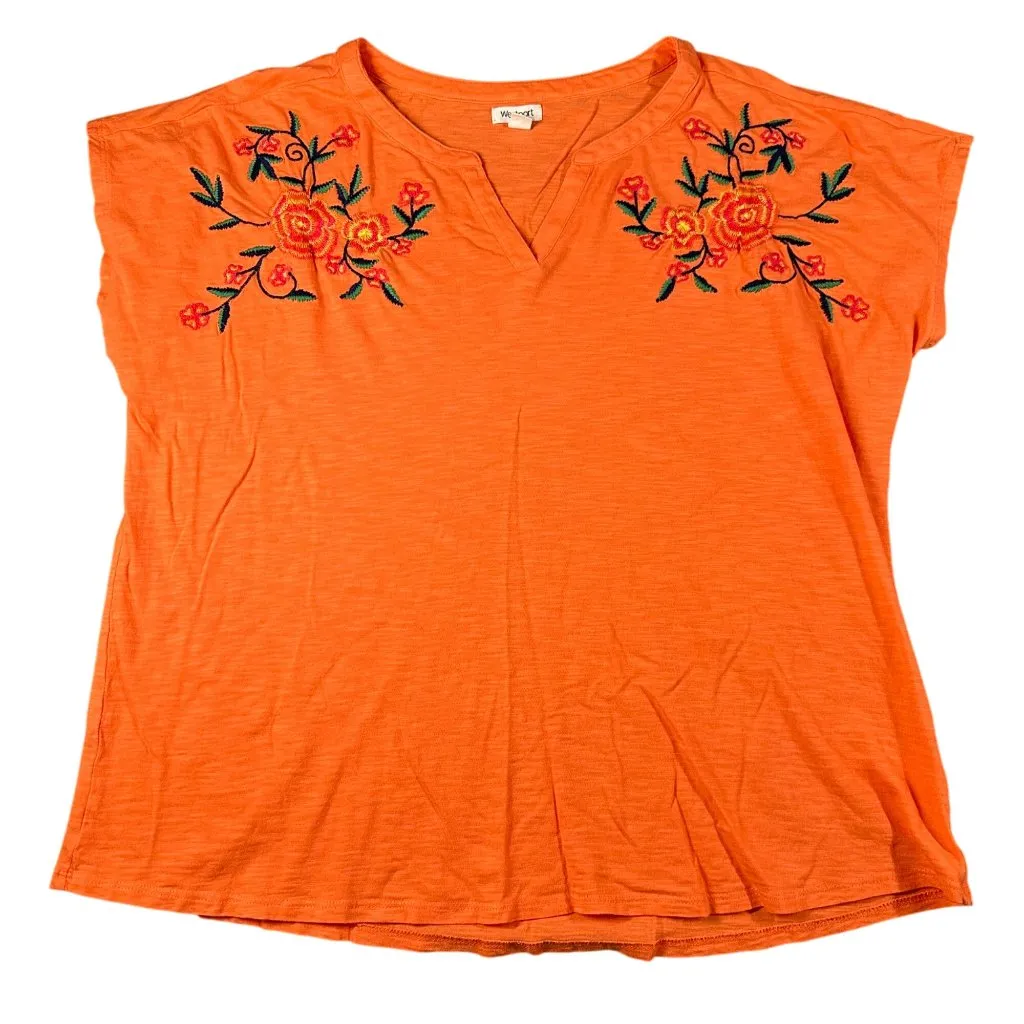 Westport Women's XL Orange Floral Embroidered Short Sleeve T-Shirt. 60% Cotton, 40% Modal Armpit to armpit measures - 23.5" Shoulder to hem measures - 25" Smoke free, dog friendly home. 6025HH3M03 Features: • Pullover Size: Women's XL Condition: Pre-Owned Good Good pre-owned condition