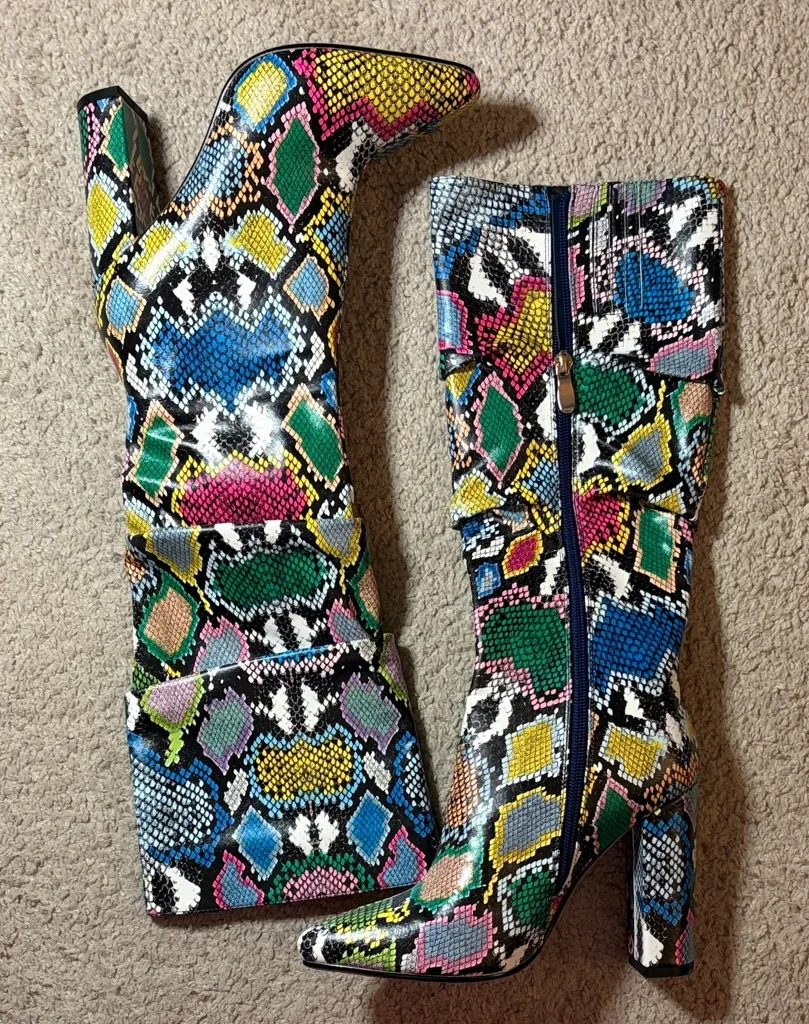 Like new condition - zero flaws! Women’s size 7 - Step out in style with these vibrant knee-high boots featuring a striking snakeskin pattern. Perfect for adding a pop of color to any outfit.