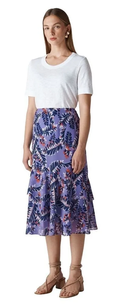 This Josephine Skirt from Whistles is brand new with tags. It has a unique print and flattering silhouette, with frill details. It features; purple floral print, Midi length, side zipper closure, lined and is crafted from 100% polyester. Condition: NWT Color: Purple Material: polyester Size: 2 Measurements: waist side to side 12.5 in, length 31 in, casual, classic, colorful, midi, maxi, party, workwear, business, holiday, Christmas, trendy, multicolor, Beachy, Flowy, Floral, Flower, Botanical, Garden, Patchwork, Hobo, Folk Multicolor, Mixed Print, comfortable, comfort, lightweight, form-flattering, slimming, a line, designer, colorful, designer, tiered, ruffle, boho, bohemian, printed column, purple printed