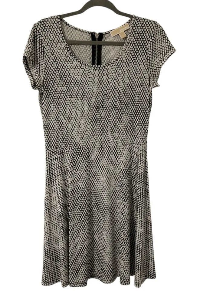 Cute White & Black Michael Kors MK Designer Dress. Love the Snake Animal Pattern. See photos for estimated length. Good condition. Quality brand. Lightweight soft material. Zippers in the back. Stretchy fit. Women’s size Small. Closet fave!