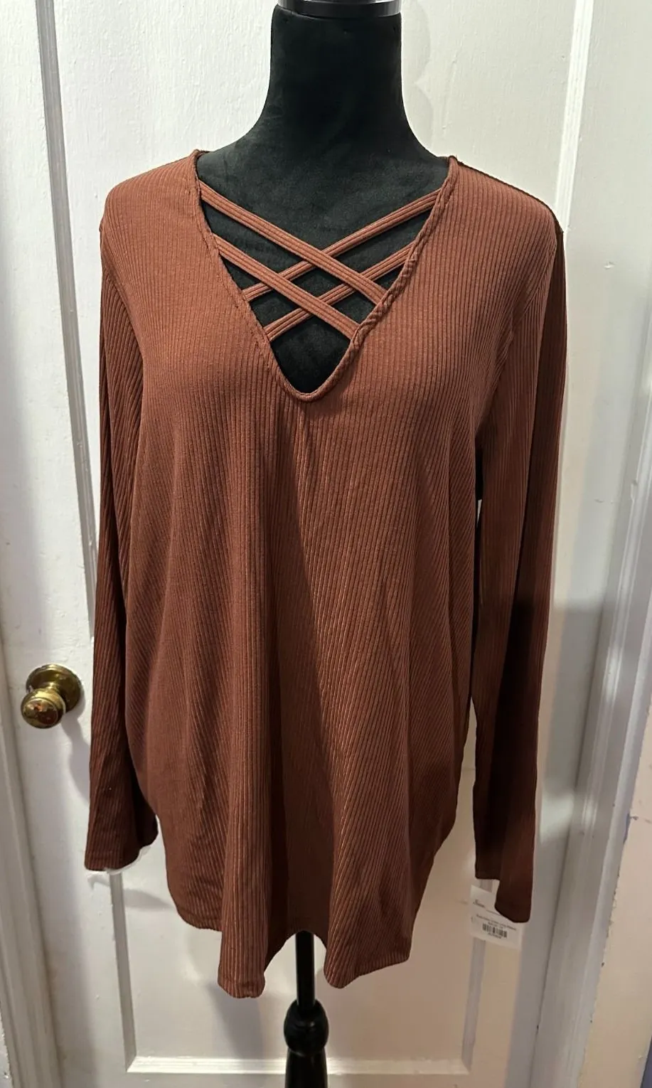 15The White Birch Brown Ribbed Long Sleeve blouse with Criss Cross Detail in 2X is a stylish and ver... Show more