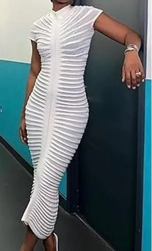 Step into sophistication with this stunning white midi dress, a silhouette designed to turn heads. Ribbed horizontal patterns sculpt the body, accentuating your curves, while a refined mock neckline adds a touch of elegance. A center seam runs the length of the dress, adding subtle definition and lengthening the figure. The short sleeves provide a modest yet modern touch, making this dress ideal for an evening cocktail party, a night out at the club, or any event where you want to make a lasting impression. Style: Bodycon, Pencil Dress Dress Length: Midi Color: White Department: Women Sleeve Length: Short Sleeve Pattern: Solid Occasion: Party/Cocktail Material: Polyester Blend, Nylon, Rayon, Viscose Neckline: Mock Neck Character: Elegant, Sophisticated, Classy, Glamorous, Chic Fabric Type: Knit Keywords: white midi dress, bodycon dress, ribbed dress, mock neck dress, short sleeve dress, party dress, cocktail dress, clubwear, fitted dress, womens fashion, evening dress, occasion dress, date night dress