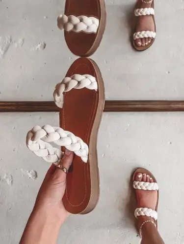 This braided flat sandal is made for walking it's the cutest thing going on! You will be utterly smitten with these sandals and there braided straps and cushion insole- literally perfect for summer! Faux Leather. Strappy Front. Platform:. 75"