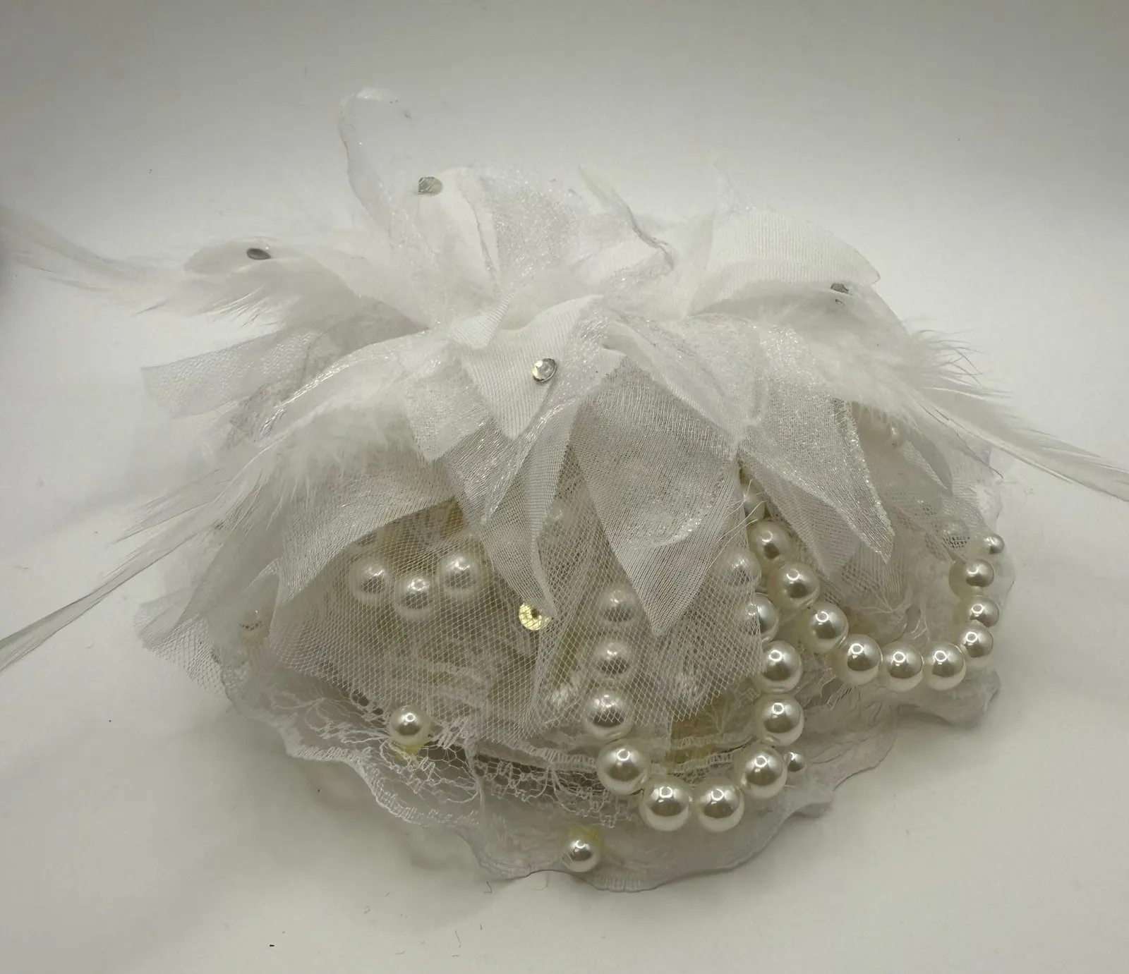 A delicate white floral hair clip adorned with pearls, sparkling rhinestones, and soft feathers. This accessory features multiple layers of sheer fabric petals creating a full bloom effect, accented by scattered pearl beads and shimmering rhinestones. Feather accents add a light and airy touch, while a lace trim along the base provides an elegant finish. Two silver alligator clips are securely attached to the back for a firm hold. Measurements: • Approximately 5 inches in diameter Type: Fascinator Material: Feather, Pearl, Fabric, Lace, Chiffon Keywords: bridal, wedding, hairpiece, fascinator, floral, pearls, rhinestones, feathers, special occasion, hair adornment, elegant, boutique Item is preowned, effort has been made to ensure all flaws are displayed photos serve as additional description Sizing varies by manufacturer and time period, please see measurements.