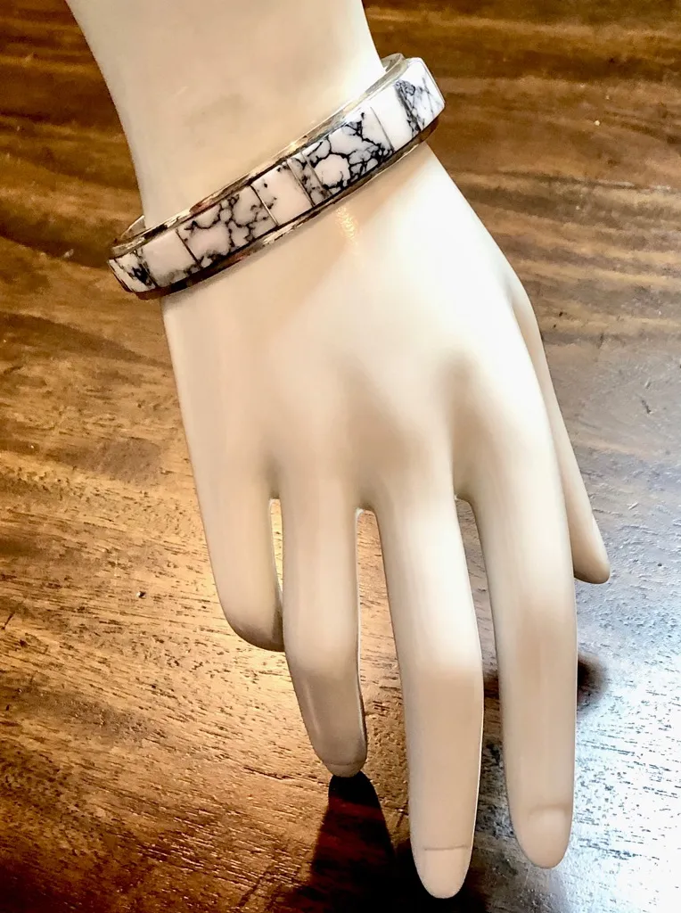 WHITE BUFFALO Sterling Silver Mosaic Inlay Navajo Cuff Bracelet Steve Francisco Crafted Sterling Silver Tapered Cuff Bracelet White Buffalo with Black Veining Inlaid Mosaic Design with Sterling Silver Soldering Marked: SF, Sterling Sizable By a Jeweler Alone - Risk of Fracturing The Mosaic Inlay and/or Cracking the Cuff Can Destroy The Bracelet if a Professional Isn’t Utilized CARE: Avoid Chemicals/Polishes As kThey May Strip Manufacturer’s Finish, Yellow Vintage Silver, Damage Porous Gemstones. Store In Airtight Jewelry Bag When Not In Use To Prevent Tarnishing. Consult Professional Jeweler For All Sizing, Maintenance Requests To Prevent Irreversible Damage. Colors May Vary Based On Shadows, Lighting, Monitor, Display Settings Ask Questions and/or Request Additional Photos, Measurements as Needed Photos of Measurements are Available in The Slides No Returns, No Exchanges, No Trades, No Cancellations, No Accidental Bids ALL PHOTOS, DESCRIPTIONS, INTELLECTUAL PROPERTY ARE COPYRIGHT PROTECTED. ALL LEGAL RIGHTS RESERVED AND PROTECTED BY DMCA AND WILL BE LEGALLY