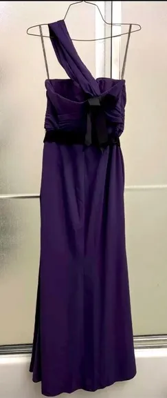 Command attention in this White by Vera Wang formal gown, a vision in amethyst. The elegant one-shoulder design drapes gracefully, complemented by a chic black bow at the waist that accentuates the figure. Its flowing silhouette and sophisticated color make it a standout choice. Perfect for a black-tie event, a formal wedding, or an elegant gala, this gown ensures you'll make a memorable entrance. Keywords: White by Vera Wang, formal gown, one shoulder dress, amethyst dress, evening gown, size 4, black tie, wedding guest dress, prom dress, special occasion dress, long dress, bridesmaid dress, party dress, cocktail dress
