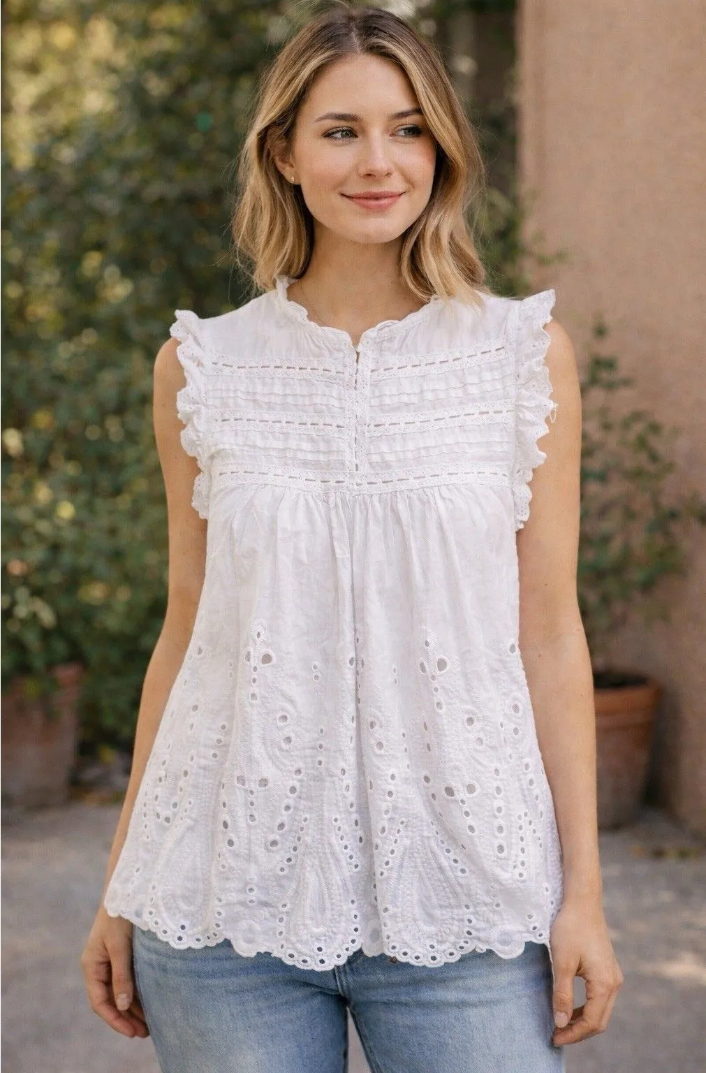 White Eyelet Lace Sleeveless Babydoll Top Pintuck Ruffle Trim Boho Cottagecore M Size M - $15 - From Rachelle L