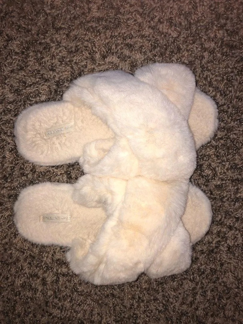 White/cream fuzzy slippers! Only worn a few times, super soft and cozy! Hard bottom. Would fit 8-9!... Show more