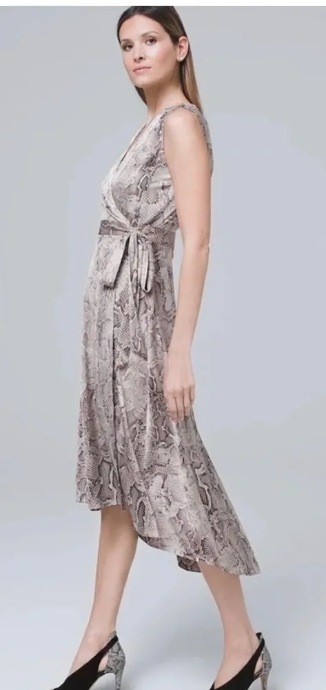 Step out in style with this elegant snake print wrap dress. Perfect for any occasion, this dress features a flattering silhouette and a chic design. The neutral tones make it versatile and easy to pair with your favorite accessories. Brand new with tags Size 6