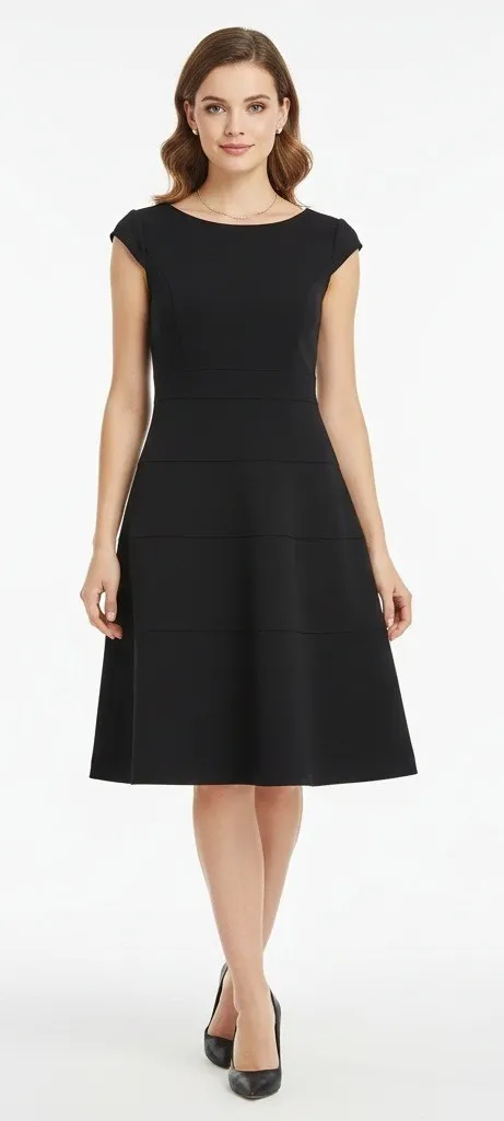 Black fit & flare dress Scoop neckline Cap sleeves Seam detailing throughout bodice and skirt Fitted... Show more