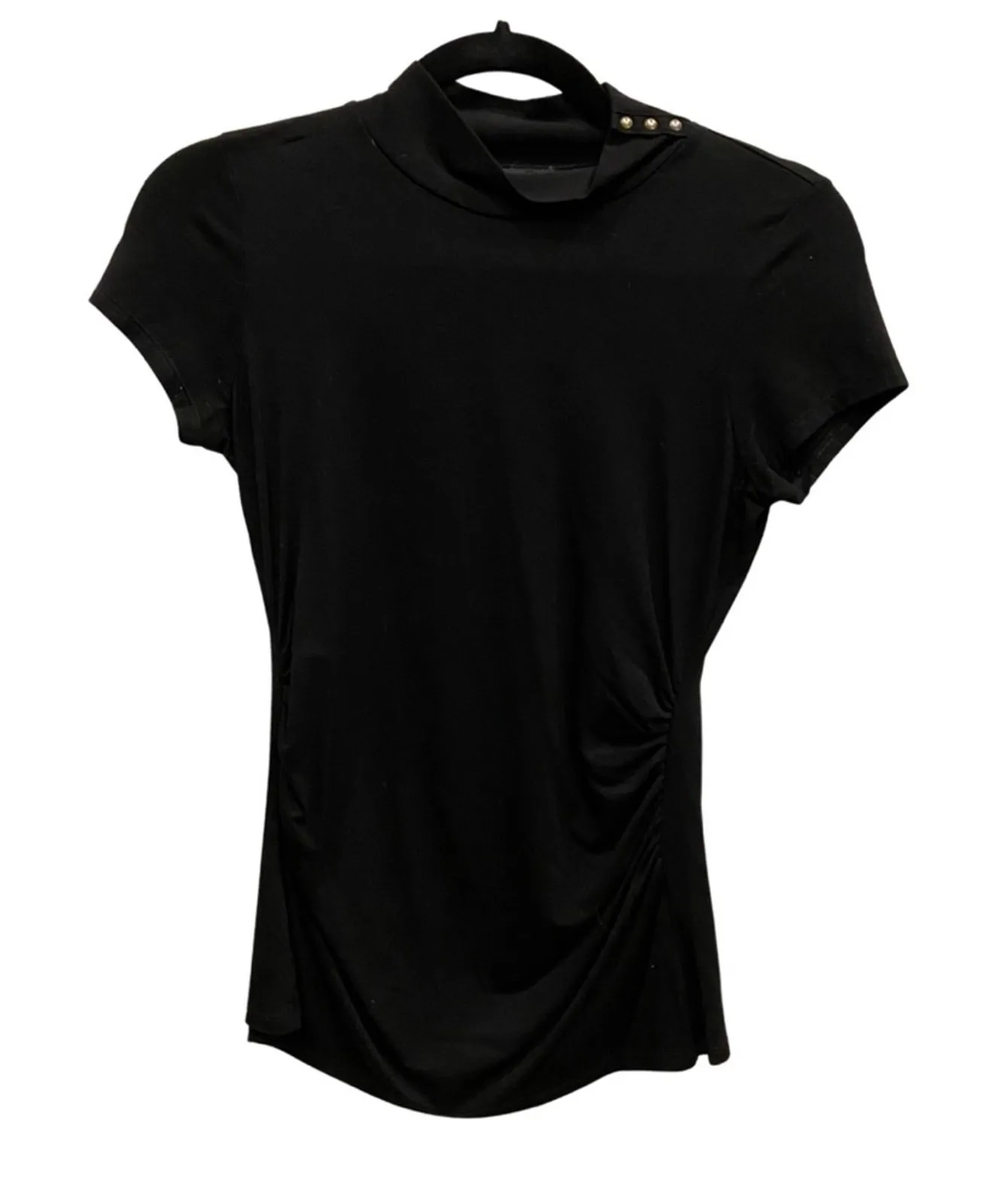 White House Black Market WHBM Black High Mock Neck Blouse Short-sleeved Shirt Top Gold Stud accents... Show more