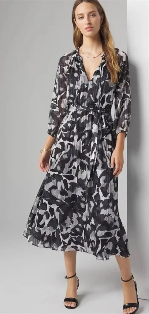 This White House Black Market abstract print midi dress in size Small features a belted waist, sheer... Show more