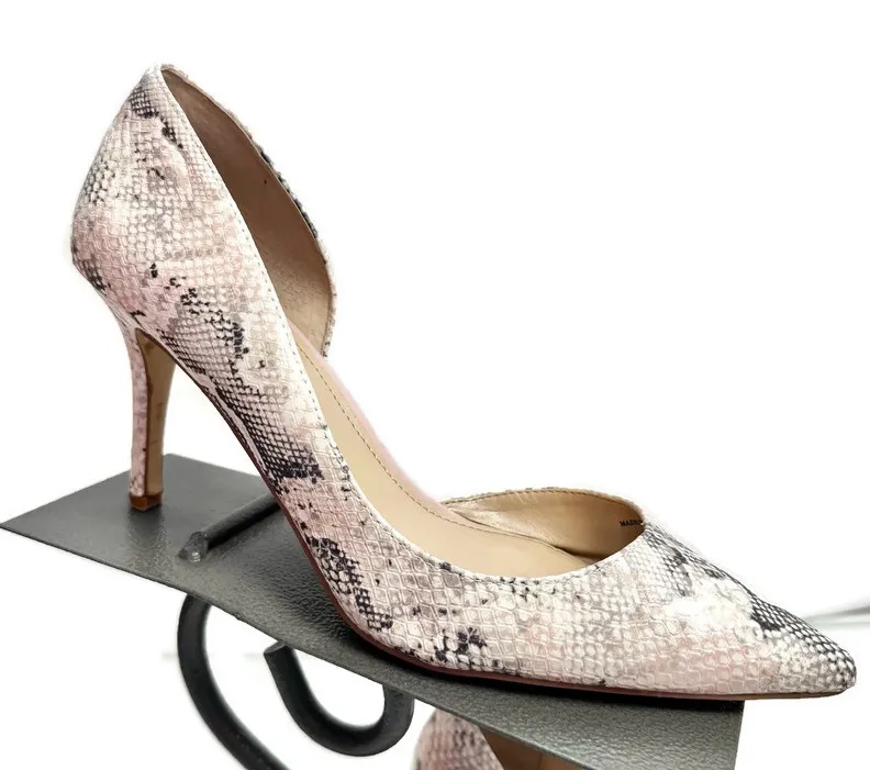 Used condition. Neutral light pink and tan snake skin heels. D’orsay style with appointed toe. Pleas... Show more
