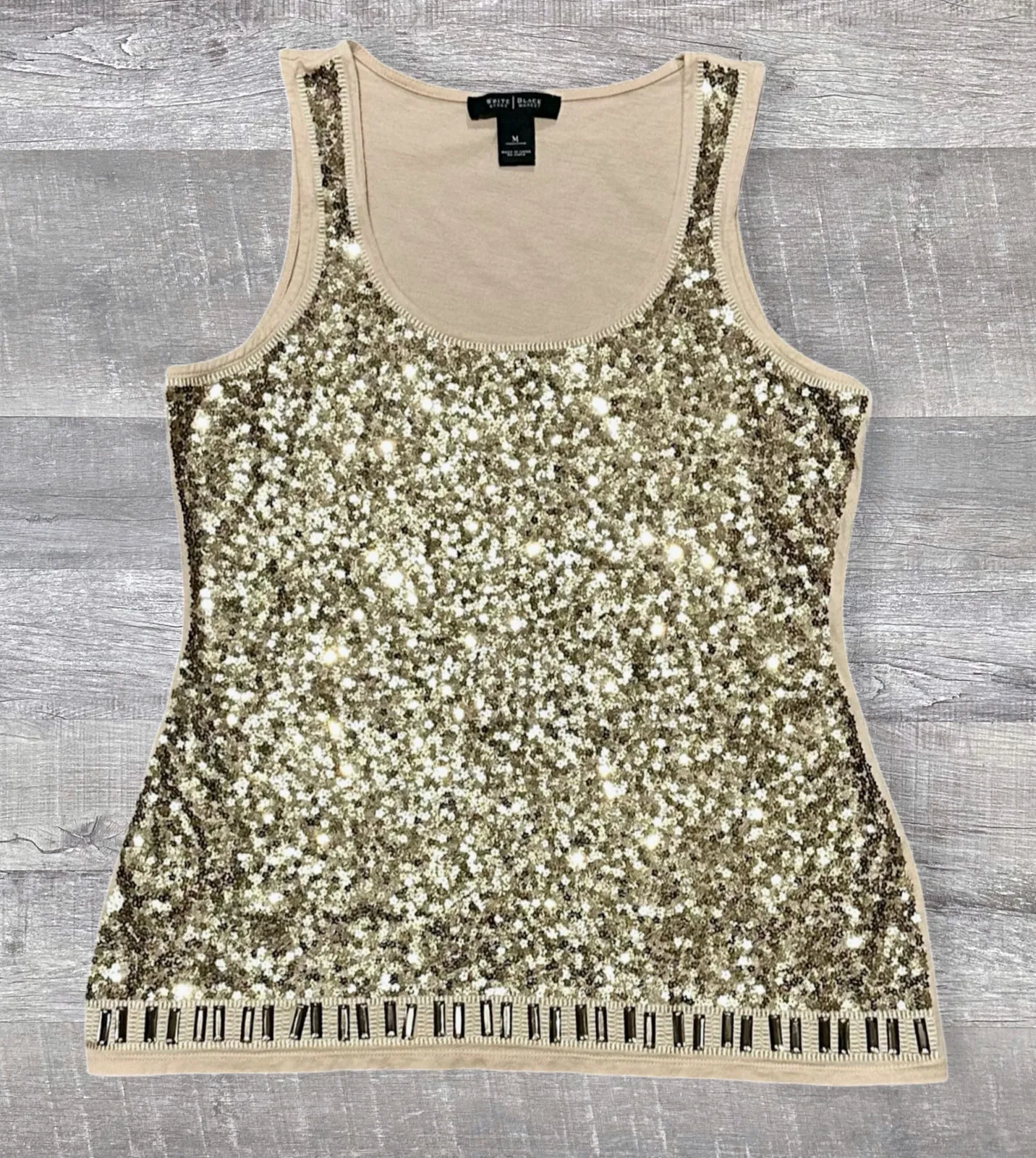 White House Black Market Gold Sequin Tank Top Metallic Bling Scoop Neck 59% Cotton / 41% Modal Mach... Show more