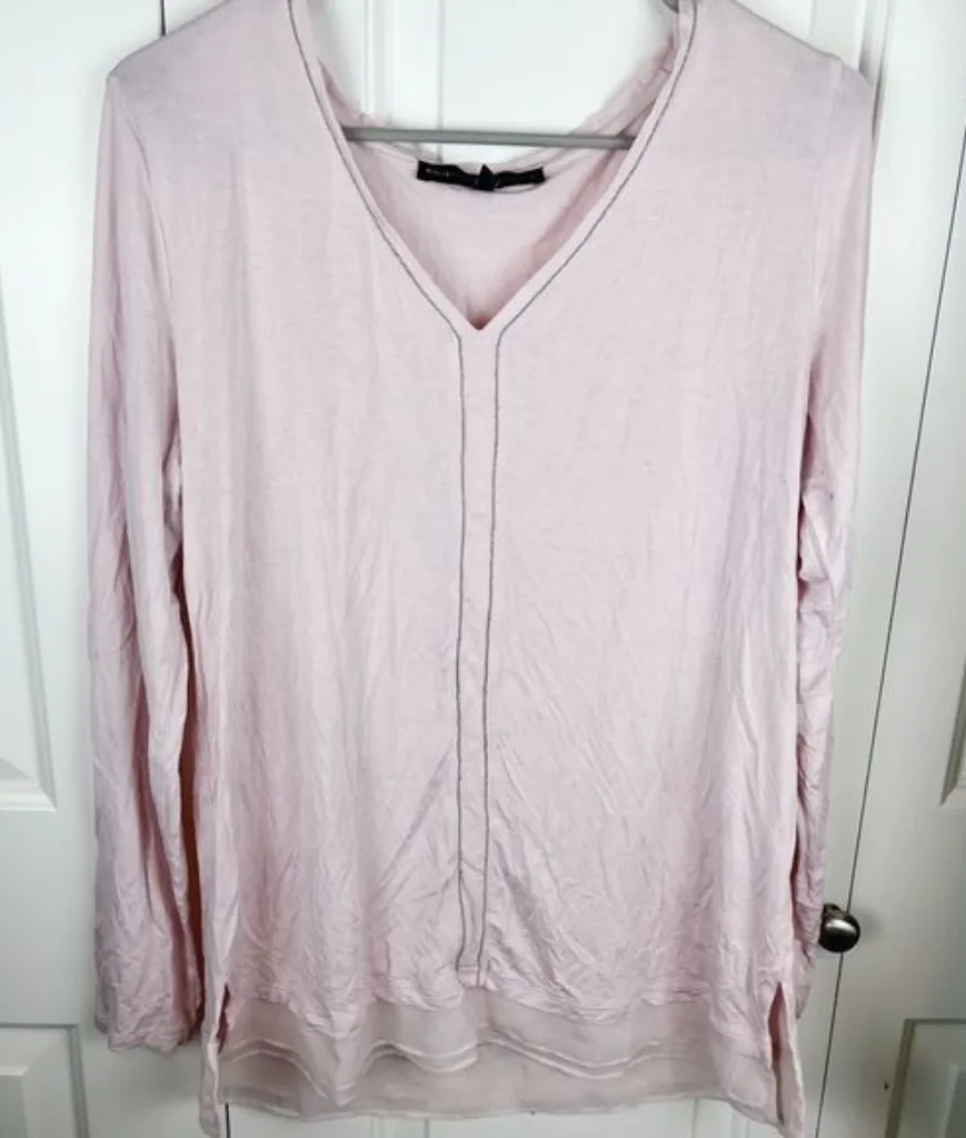 From WHBM comes this pink on pink chifffon tiered hem long sleeve vneck with ball chain neckline det... Show more
