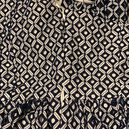 Good, used condition. WHBM strapless tiered ruffle eyelet dress. Navy & white, called ''Admiral'. F... Show more
